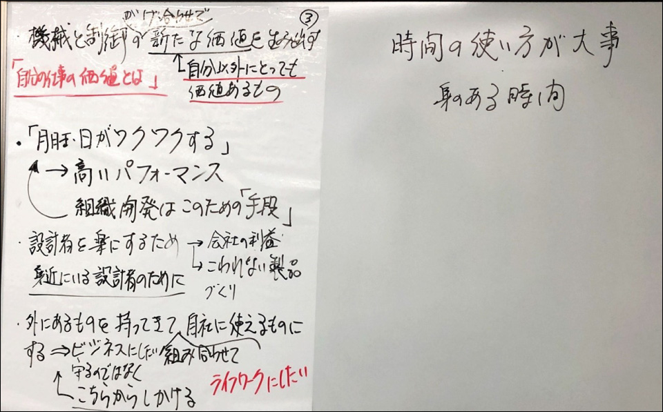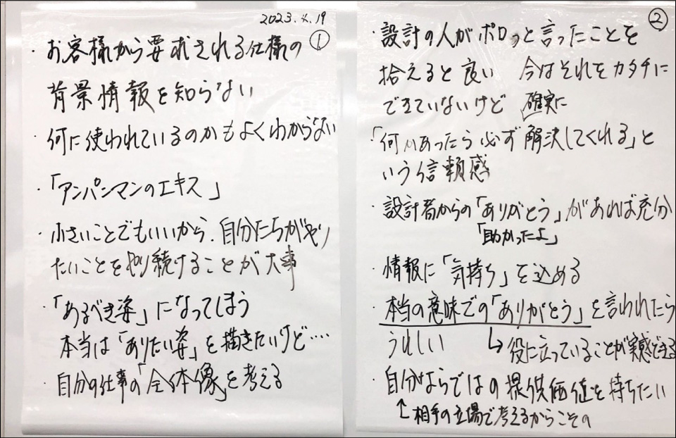 どんな仕事でも必ず相手がいますから、誰に対してどのような貢献をしているのか、仕事で相手から言われてうれしかったことは何かを、みんなで語り合いました。