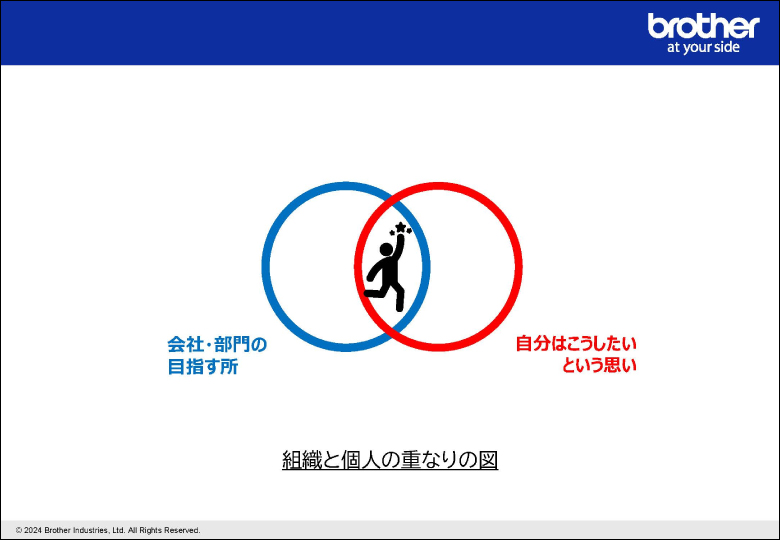 最初の取り組みは、個人のミッションを言語化することでした。組織と個人の重なりの図で示した赤い円の部分です。